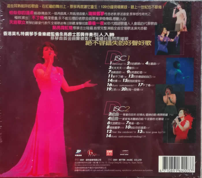 Disc 1 1. Opening 2. 你的眼神 4. 出塞曲 5. 天天天天 6. 讀你 7. 油麻菜籽 9. 點亮霓紅燈 11. 新不了情 12. 把悲傷留給自己 14. 抉擇 15. 跟我說愛我 16. Music instruments 17. 不了情 19. 三年 20. 我有一段情 Disc 2 2. 組曲-等著你回來/好預兆/愛神的箭/南屏晚鐘 4. 組曲-家家有本難念的經(jīng)/午夜香吻/好春宵 6. 天涯歌女 7. 最后一夜 8. 魂縈舊夢 10. 恰似你的溫柔 12. Over the rainbow 13. As time goes by 14. Music instruments+ending