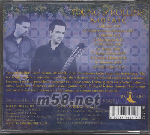 MOSAIC 馬賽克(m58.net) 結他雙雄YOUG&ROLLINS最新專輯,將吉他二重奏以最頂尖技巧展現.全碟收錄十首作品,盡現天衣無縫之合作技術,多才多藝的音樂造詣及無窮盡的創作性,發燒級靚聲錄音.充滿激情及熱情的旋律令人迷醉.