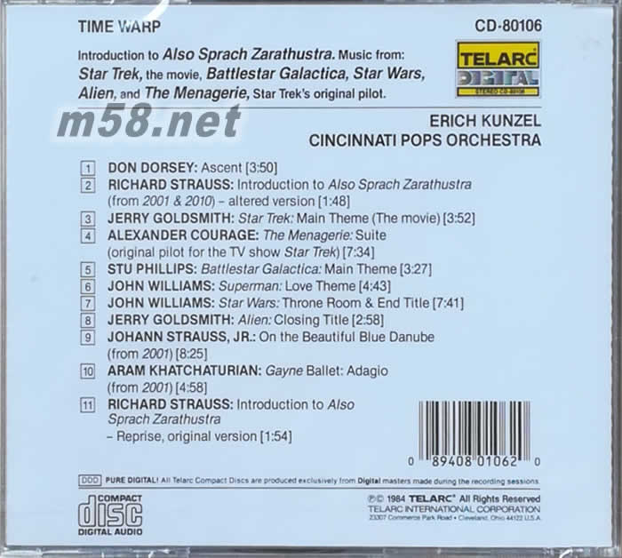 Ascent for synthesizerAlso sprach Zarathustra (Thus Spoke Zoroaster), tone poem for orchestra, Op. 30 (TrV 176): Introduction (altered version) (as used in the films 2001 and 2010Star Trek I, film score: Main ThemeMenagerie: Suite, TheBattlestar Galactica, film score: Main ThemeSuperman, film score: Love ThemeStar Wars, Episode IV: A New Hope, film score: Thorne Room & End TitleAlien, film score: Closing Titleder schönen, blauen Donau, An (On the Beautiful, Blue Danube), waltz for orchestra (with chorus ad lib), Op. 314 (RV 314)Gayane, ballet in 4 acts: Adagio (from 2001)Also sprach Zarathustra (Thus Spoke Zoroaster), tone poem for orchestra, Op. 30 (TrV 176): Introduction (original version) (Reprise)Album Remarks & Appraisals: