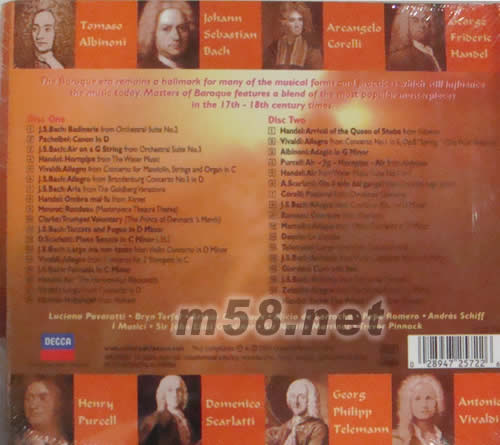 DISC ONE 01.J.S.Bach:Badinerie from Orchestral Suite No.2 02.Pachelbel:Canon In D 03.J.S.Bach:Air on a G String from Orchestral Suite No.3 04.Handel:Hornpipe from The Water Music 05.Vivaldi:Allegro from Concerto for Mandolin,Strings and Organ in c 06.J.S.Bach:Allegro from Brandenburg Concerto No.5 in D 07.J.S.Bach:Aria from The Goldberg Variations 08.Handel:Ombra mai fu from xerxes 09.Mouret:Rondeau 9Masterpiece Theatre Theme) 10.Clarke:Trumpet Voluntary (The Prince of Denmark’s March) 11.J.S.Bach:Toccata and Fugue in D Minor 12.D.Scarlatti:Piano Sonata in C Minor,1352 13.J.S.Bach:Largo ma non tanto from Violin Concerto in D Minor 14.Vivaldi:Allegro from Concerto for 2 Trumpets in c 15.J.S.Bach:Fantasia in C Minor 16.Handel:Air “The Harmonious Blacksmith” 17.Vivaldi:Largo from Concerto in D 18.Handel:Hallelujah from Messiah DISC TWO 01.Handel:Arrival of the Queen of Sheba from Solomon 02.Vivaldi:Allegro from Concerto No.1 in E,Op.8 “Spring”(The Four Seassons) 03.Albinoni:Adagio in G Minor 04.Purcell:Air-jig-Hornpipe-Air from Abdelazer 05.Handel:Air from Water Music Suite No.1 in F 06.A.Scarlatti:Gla il sole dal gangel from L’onesta negli amori 07.Corelli:Pastoral from Christmas Concerto 08.J.S.Bach:Allegro from Concerto No.1 in D Minor 09.Rameau:Overture from Dardanus 10.Marcello:Adagio from Oboe Concerto in D Minor 11.Daquin:Le coucou 12.Telemann:Largo from viola Concerto in G 13.J.S.Bach: Andante from violin Concerto No.1 in A Minor 14.Giordani:Caro mio ben 15.J.S.Bach:Sinfonia from Christmas Oratorio 16.Zelenka:Allegro from trio sonata No.6 in C Minor 17.Handel:Zadok The Priest (Coromation Anthem)
