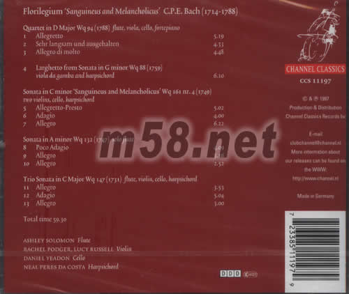 QUARTET IN D MAJOR WQ 94(1788)FLUTE,VIOLA,CELLO,FORTEPIANO 1.ALLEGRETTO 2.SEHR LANGSAM UND AUSGEHALTEN 3.ALLEGRO DI MOLTO 4.LARGHETTO FROM SONATA IN G MINOR WQ88(1759) TWO VIOLINS ,CELLO,HARPSICHORD 5.ALLEGRETTO-PRESTO 6.ADAGIO 7.ALLEGRO SONATA IN A MINOR WQ132(1747)SOLO FLUTE 8.POCO ADAGIO 9.ALLEGRO 10.ALLEGRO TRIO SONATA IN C MAJOR WQ147(1731)FLUTE,VIOLIN,CELLO,HARPSICHORD 11.ALLEGRO 12.ADAGIO 13.ALLEGRO