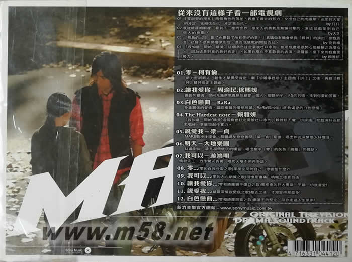 01. 零 - 柯有倫 /新力密訓新人,創(chuàng)作才華備受肯定,繼[求婚事務所]主題曲[拼了]之后,再戰(zhàn)[戰(zhàn)神]精神指定主題曲。 02. 讓我愛你 - 周渝民 徐熙媛 /撕裂的靈魂,如何充滿勇氣義無反顧愛一個人,細聽仔仔、大S的共鳴,找到你要的答案。 03. 白色戀曲 - RaRa/多重關系的愛情,錯綜復雜的情感糾葛,RaRa唱出你心底最渴望的白色戀情。 04. The Hardest Note - 賴雅妍/[我知道一開始“晴美”這個角色注定要被吐口水的]賴雅妍不惜一切評語,把戲演好也把歌唱好,更展現(xiàn)創(chuàng)作實力。 05. 說愛我 - 梁一貞 /MARS戰(zhàn)神后援會,群體網(wǎng)友急急詢問[梁一貞]是誰,唱出如此深情感人好聲音。 06. 明天 - 大地樂團 /紅遍對岸,清亮卻帶低沉的嗓音,唱出劇中[零]的灰色[綺羅]的殘缺。 07. 我可以 - 游鴻明/情歌天王,力作驚人表現(xiàn),唱功火喉不用再多說。 08. 零…(零的自我分裂之歌)零度空間的自己,你害怕什么? 09. 我可以…(零的內心吶喊之歌)回憶是傷痛,吶喊之后更自由。 10. 讓我愛你…(零和綺羅撫平傷口之歌)哪里來的巨大勇氣,不顧一切就要愛! 11. 說愛我…(綺羅深情說愛我這歌)離去之后,才知愛得那么多! 12、白色戀曲…(零和綺羅甜蜜之歌)牽著手的堅定,陪你走過人生風雨!