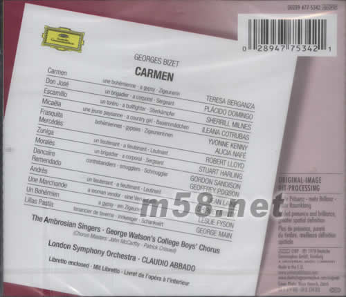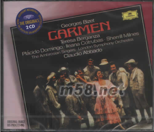 CARMEN TERESA BERGANZA 比才卡門 大禾花版(m58.net) 這套《比才:卡門》由DG唱片公司發(fā)行于2005年,克勞迪奧?阿巴多指揮倫敦交響樂(lè)團(tuán)演奏錄制,普拉西多?多明戈、泰蕾莎?貝爾岡薩等演唱。 歌劇《卡門》完成于1874年秋,是比才的最后一部歌劇,也是當(dāng)今世界上上演率最高的一部歌劇。 四幕歌劇《卡門》主要塑造了一個(gè)相貌美麗而性格倔強(qiáng)的吉卜賽姑娘—煙廠女工卡門??ㄩT使軍人班長(zhǎng)唐?豪塞墮入情網(wǎng),并舍棄了他在農(nóng)村時(shí)的情人—溫柔而善良的米卡愛拉。后來(lái)唐?豪塞因?yàn)榉抛吡伺c女工們打架的卡門而被捕入獄,出獄后他又加入了卡門所在的走私販的行列。卡門后來(lái)又愛上了斗牛士埃斯卡米里奧,在卡門為埃斯卡米里奧斗牛勝利而歡呼時(shí),她卻死在了唐?豪塞的劍下。 本劇以女工、農(nóng)民出身的士兵和群眾為主人公,這一點(diǎn),在那個(gè)時(shí)代的歌劇作品中是罕見的、可貴的。也許正因?yàn)樽髡叩目桃鈩?chuàng)新,本劇在初演時(shí)并不為觀眾接受,但隨著時(shí)間的推移,這部作品的藝術(shù)價(jià)值逐漸得到人們的認(rèn)可,此后變得長(zhǎng)盛不衰。這部歌劇以合唱見長(zhǎng),劇中各種體裁和風(fēng)格的合唱共有十多部。歌劇的序曲為A大調(diào),四二拍子,回旋曲式。整部序曲建立在具有尖銳對(duì)比的形象之上,以華麗、緊湊、引人入勝的音樂(lè)來(lái)表現(xiàn)這部歌劇的主要內(nèi)容。序曲中集中了歌劇內(nèi)最主要的一些旋律,而且使用明暗對(duì)比的效果將歌劇的內(nèi)容充分地表現(xiàn)了出來(lái),主題選自歌劇最后一幕中斗牛士上場(chǎng)時(shí)的音樂(lè)。本劇的序曲是音樂(lè)會(huì)上經(jīng)常單獨(dú)演奏的曲目。 第一幕中換班的士兵到來(lái)時(shí),一群孩子在前面模仿著士兵的步伐開路,唱著笛鼓進(jìn)行曲《我們和士兵在一起》。在這一幕塑造了吉卜賽姑娘卡門熱情、奔放、富于魅力的形象。主人公卡門的著名詠嘆調(diào)《愛情像一只自由的小鳥》是十分深入人心的旋律,充分表現(xiàn)出卡門豪爽、奔放而富有神秘魅力的形象。卡門被逮捕后,龍騎兵中尉蘇尼哈親自審問(wèn)她,可她卻漫不經(jīng)心地哼起了一支小調(diào),此曲形象地表現(xiàn)出卡門放蕩不羈的性格。還是這一幕中,卡門在引誘唐?豪塞時(shí),又唱出另一個(gè)著名的詠嘆調(diào),是一首西班牙舞蹈節(jié)奏的迷人曲子,旋律熱情而又有幾分野氣, 進(jìn)一步刻畫了卡門性格中的直率和潑辣。 第一幕與第二幕之間的間奏曲也十分有名,選自第二幕中 唐?豪塞的詠嘆調(diào)《阿爾卡拉龍騎兵》,大管以中庸的快板奏出灑脫而富活力的主旋律。第二幕中還有一段吉普賽風(fēng)格的音樂(lè),表現(xiàn)的是兩個(gè)吉普賽女郎在酒店跳舞時(shí)縱情歡樂(lè)的場(chǎng)面,跳躍性的節(jié)奏和隱約的人聲烘托出酒店里喧鬧的氣氛。第二幕與第三幕之間的間奏曲是一段輕柔、優(yōu)美的旋律,長(zhǎng)笛與豎琴交相輝映,飽含脈脈的溫情。第三幕中著名的《斗牛士之歌》,是埃斯卡米里奧為感謝歡迎和崇拜他的民眾而唱的一首歌曲。這首節(jié)奏有力、聲音雄壯的凱旋進(jìn)行曲,成功地塑造了這位百戰(zhàn)百勝的勇敢斗牛士的高大形象。第四幕的結(jié)尾,正象柴科夫斯基所說(shuō)的那樣:“當(dāng)我看這最后一場(chǎng)時(shí),總是不能止住淚水,一方面是觀眾看見斗牛士時(shí)的狂呼,另一方面卻是兩個(gè)主人公最終死亡的可怕悲劇結(jié)尾,這兩個(gè)人不幸的命運(yùn)使他們歷盡辛酸之后還是走向了不可避免的結(jié)局?!?br>克勞迪奧?阿巴多為當(dāng)代著名的意大利指揮家。自幼接受音樂(lè)教育,并就學(xué)于威爾第音樂(lè)學(xué)院學(xué)習(xí)鋼琴和作曲,十歲起就開始研究指揮法,并指揮過(guò)室內(nèi)管弦樂(lè)隊(duì)。1958年在美國(guó)庫(kù)賽維斯基國(guó)際指揮比賽中獲獎(jiǎng),后在維也納音樂(lè)學(xué)院隨名家深造,1963年又在米特洛波勞斯國(guó)際指揮比賽中獲獎(jiǎng),加之在薩爾茲堡音樂(lè)節(jié)上成功地指揮了維也納愛樂(lè)樂(lè)團(tuán),使他一舉成名。1969年被聘為斯卡拉歌劇院的音樂(lè)指導(dǎo),1971年又與不設(shè)常任指揮的維也納愛樂(lè)樂(lè)團(tuán)訂立了終身契約,并以首席指揮的身份積極籌辦演出活動(dòng)。阿巴多的指揮條理清晰,節(jié)拍準(zhǔn)確,有著異常敏銳的聽覺和高度準(zhǔn)確的音樂(lè)記憶力,絕大多數(shù)情況下他都是背誦指揮的。他能夠非常自如、含蓄而又不著痕跡地把握住樂(lè)曲速度、力度、和聲和織體的變化,處理好細(xì)節(jié)的表現(xiàn)和整體平衡的關(guān)系。在有機(jī)地掌握作品的風(fēng)格和揭示樂(lè)曲的內(nèi)涵的同時(shí),他的指揮又呈現(xiàn)了意大利音樂(lè)家特有的熱情、敏感、充滿歌唱性的特點(diǎn)。 普拉西多?多明戈(Placido Domingo,1941-),著名的西班牙男高音歌唱家。生于馬德里,父母均是西班牙民族歌劇演員,九歲時(shí)全家遷居墨西哥。青年時(shí)期熱衷于斗牛和唱歌。于席德音樂(lè)學(xué)院畢業(yè)后入墨西哥國(guó)家歌劇院唱男中音。二十歲那年,以演唱《茶花女》中的阿爾弗萊德跨入男高音的行列。同年與著名女高音歌唱家薩瑟蘭在美國(guó)同臺(tái)演出歌劇《拉美
