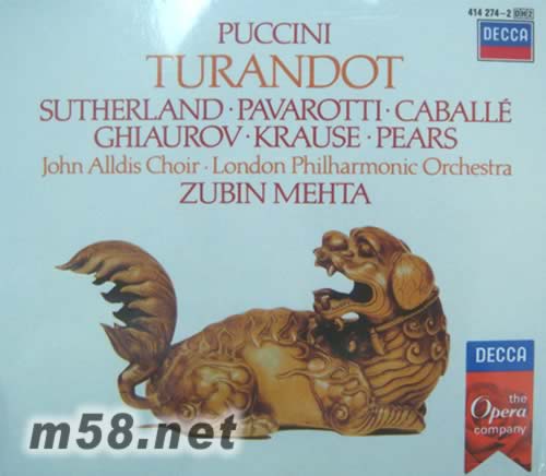 TURANDOT 普契尼歌劇 圖蘭朵(德版)(m58.net) MADE IN WEST GERMANY 其劇情描述美麗的中國公主圖蘭多特宣布:有三個謎語,能猜中的就可以招為女婿,猜不中就要殺頭。結果糾集各國的王子,波斯王子因為沒猜中,遭殺頭的命運;韃靼王子卡拉夫喬裝打扮,卻猜破了謎語。圖蘭多特因不知卡拉夫身份,不愿履行諾言。結果卡拉夫與圖蘭多特立約,要她在第二天猜出他真實姓名,不然,就要執行諾言。圖蘭多特找卡拉夫女仆探聽,女仆守秘而自殺。最終,還是卡拉夫自己說明了身份,使圖蘭多特肅然起敬,甘愿委身于他。 歌劇《圖蘭朵》 作曲:普契尼 演出: 薩瑟蘭--圖蘭朵 帕瓦羅蒂--卡拉夫 卡芭列--柳兒 …… 指揮: 祖賓-梅塔 樂團: 倫敦愛樂/倫敦Kingsway音樂廳錄音 錄音公司: DECCA 錄音年代: 1972年8月