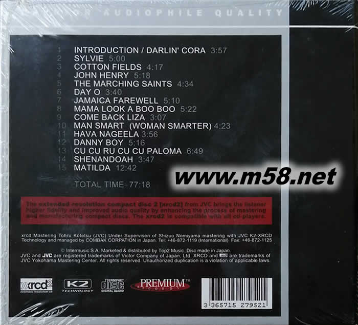 BELAFONTE AT CARNEGIE HALL 貝拉芬堤在卡耐基大廳 XRCD(m58.net) 在上世紀五、六十年代開始,他是美國流行音樂史上與貓王齊名的偉大黑人歌手,是真正的黑人民族音樂發揚者,他以摻雜西印度群島加利帕騷(galypso)風格的演唱特色而傾倒眾生。與貓王的英年早逝相對比,BELAFONTE可說是株長青樹,他德高望重,健康長壽。熱心公益事業,本張專輯的絕靚現場演出,就是為做慈善。技佳,德美,傾倒眾生。幾十年來,一直是美國發燒界的模子。 他的嗓音中氣十足,嘹亮渾厚,肺活量大得驚人,嘖嘖,就憑這樣的底氣,不服不行。他既擅長古典,也擅長爵士,絕對發燒的一把好嗓!值得收藏! 由JVC獨家開發的XRCD,是經由JVC研發的K2雷射定位錄音技術,重新製作母帶。JVC獨家開發的K2超級數字編碼器,可消除極大的低電頻信號的諧波失真,減少系統運行時不純凈的交流電對數碼的雜波干擾,這樣技術使得原音得以忠實重現。XRCD全部按照16bit / 44.1KH2的CD標準製作,所以不需要特殊的CD唱盤或譯碼器就能明顯展現出與眾不同的優越性。