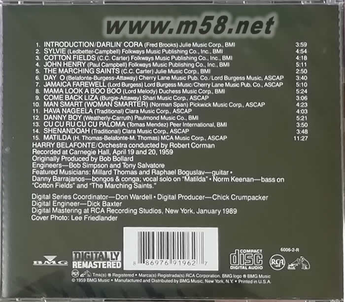 BELAFONTE AT CARNEGIE HALL 貝拉芬堤在卡耐基大廳(m58.net) 在上世紀五、六十年代開始,他是美國流行音樂史上與貓王齊名的偉大黑人歌手,是真正的黑人民族音樂發揚者,他以摻雜西印度群島加利帕騷(galypso)風格的演唱特色而傾倒眾生。與貓王的英年早逝相對比,BELAFONTE可說是株長青樹,他德高望重,健康長壽。熱心公益事業,本張專輯的絕靚現場演出,就是為做慈善。技佳,德美,傾倒眾生。幾十年來,一直是美國發燒界的模子。 他的嗓音中氣十足,嘹亮渾厚,肺活量大得驚人,嘖嘖,就憑這樣的底氣,不服不行。他既擅長古典,也擅長爵士,絕對發燒的一把好嗓!值得收藏!