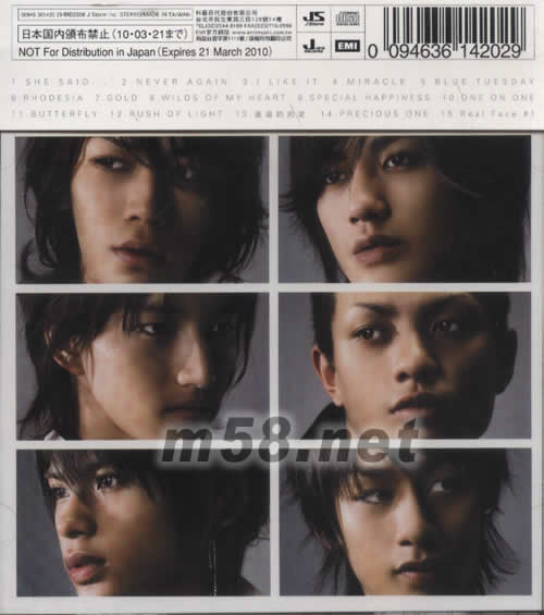 BEST OF KAT-TUN(m58.net) Johnny's事務所旗下的KAT-TUN,由龜梨和也、赤西仁、田口淳之介、田中圣、上田龍也和中丸雄一于2001年組成。在成軍5年后的3月22日正式出道,當天將同時發售DVD,專輯和單曲。 Best of KAT-TUN這張專輯集合了七首新歌以及七首KAT-TUN在Jr.時期在電視或者演唱會中發表的歌曲:SHE SAID. . . ,NEVER AGAIN , I LIKE IT , GOLD , ハルカナ約束 ,PRECIOUS ONE。這些曾經都只能聽到伴有雜音的現場版, 現在終于可以聽到完整的錄音版本的。同時七首新歌,有三首歌是成員兩兩組合演唱的曲目:龜梨和也&田口淳之介的 SPECIAL HAPPINESS ;田中圣&中丸雄一的one on one;赤西仁&上田龍也的BUTTERFLY。