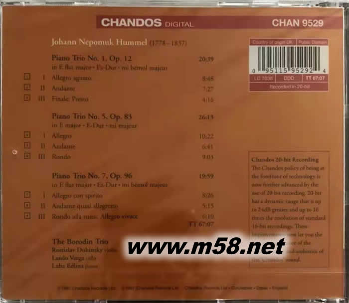 包羅丁三重奏 胡梅爾 HUMMEL PIANO TRIOS 1,5&7 (鋼琴、小提琴、大提琴)(m58.net) THE BORODIN TRIO LUBA EDLINA 鋼琴 ROSTISLAV DUBINSKY 小提琴 YULI TUROVSKY 大提琴 胡梅爾:3首鋼琴三重奏,包羅丁三重奏團(tuán)。胡梅爾是古典時(shí)期重要的作曲家,他是莫扎特的唯一“入室弟子”,在世時(shí)聲譽(yù)甚至超過(guò)與他同時(shí)的貝多芬,他的音樂(lè)作品有溫磬流暢的旋律、典雅簡(jiǎn)潔的樂(lè)句、歡快明朗的節(jié)奏,豐富精致的積體,讓聆聽(tīng)者感受到十分美妙的音樂(lè)享受。鮑羅丁三重奏團(tuán)演奏的這個(gè)版本獲得高度評(píng)價(jià)。