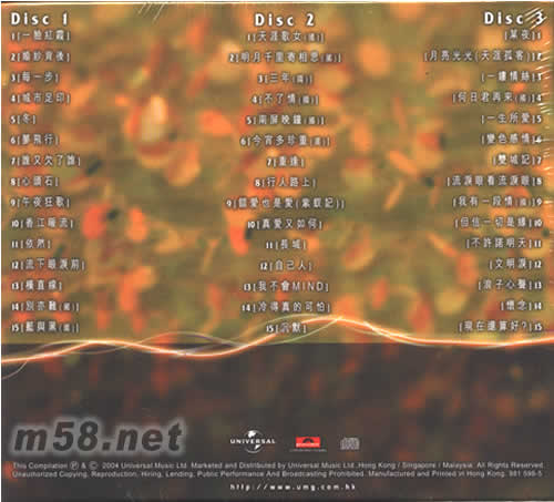 DISC 1 1、一臉紅霞 2、婚紗背后 3、每一步 4、城市足印 5、冬 6、夢飛行 7、誰又欠了誰 8、心頭石 9、午夜狂歌 10、香江暖流 11、依然 12、流下眼淚前 13、橫直泉 14、別亦難 15、藍(lán)與黑 DISC 2 1、天涯歌女 2、明月千里寄相思 3、三年 4、不了情 5、南屏晚鐘 6、今宵多珍重 7、重逢 8、行人路上 9、錯愛敢是愛 10、真愛又如何 11、長城 12、自己人 13、我不會MIND 14、冷得真的可怕 15、沉默 DISC 3 1、某夜 2、月亮光光(天涯孤客) 3、一縷情絲 4、何日君再來 5、一生所愛 6、變色感情 7、變城記 8、流淚眼看流淚眼 9、我有一段情 10、但信一切是緣 11、不許諾明天 12、文明淚 13、浪子心聲 14、懷念 15、現(xiàn)在還算好?