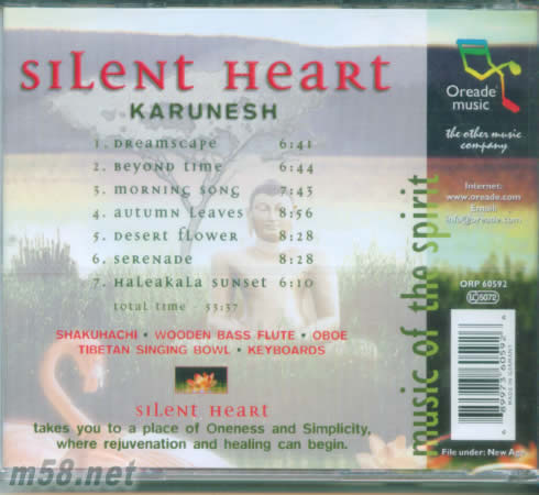 寂靜的心靈 Silent Heart 新世紀純音樂(m58.net) 冥想類音樂的代表人物Karunesh于1956出生在德國科隆。他從小就與音樂結下了不解之緣,并加入了各式各樣的少年樂隊參加了很多演出表演。他修的是圖形設計專業,但卻經常感覺到這不是他生命中真正期待的東西。在經歷了一場差點讓他喪命的車禍后,他毅然決定放棄原有的工作。這次“接近死亡”的經歷成為他生命中靈魂的一次轉折點。Karunesh旅行至印度,他在poona的阿什拉姆(印度教徒隱居地)遇到Osho,正式為自己取了個宗教名字----karunesh,梵文中意為“同情”。 回到德國后Karunesh在漢堡附近的Rajneesh生活了5年。那里為他音樂的發展提供了精神源泉。在那里他結識了許許多多來自世界各地的音樂家,把各種文化中不同風格和情感的音樂巧妙的聯系在一起,創作了很多專輯里,音樂里的氣氛和節奏,會讓你忍不住舞動起來。