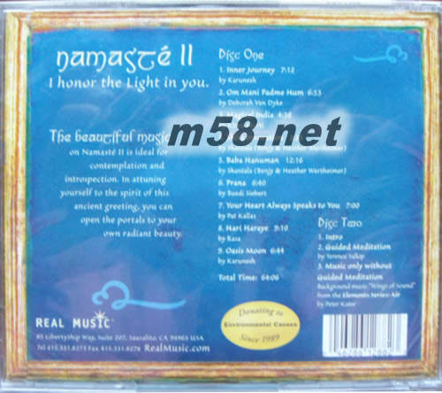 Namaste II 心靈冥想音樂專輯 (二) 新世紀純音樂(m58.net) I honor the Light in you. The beautiful music on Namasté II is ideal for contemplation and introspection. In attuning yourself to the spirit of this ancient greeting, you can open the portals to your own radiant beauty. On the second CD is a recorded meditation that will gently guide you from a safe place in nature to a meeting with your more real Self.