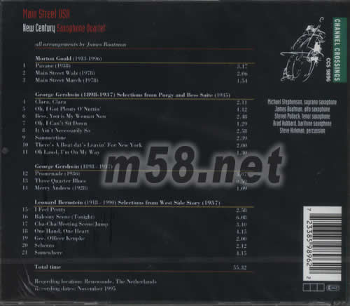 MORLON GOULD (1913-1996) 1.PAVANE(1938) 2.MAIN STREET WALZ(1978) 3.MAIN SUREET MAREH(1978) GEORGE GERSHWIN(1898-1937)SELETIONS FROM PORGY AND BESS SUITE(1935) 4.CLARA.CLARA 5.OH .L GOT PLENTY O'NUTTIN 6.BESS,YOU IS MY WOMAN NOW 7.OH.I GAN'T SIT DOWN 8.IT AIN 'T NECESSARILY SO 9.SUMMERTINE 10.THERE'S A BOAT DAT'S LEAVIN'LEAVIN'FOR NEW YORK 11.OH LAWD.I'MON MY WAY GEORGE GERSHWIN(1898-1937) 12.PROMENADE(1936) 13.THREE QUARLER BLUES 14.MERRY ANDREW(1928) LEONARD BERNSLEIN(1918-1990)SELEETIONS FROM WEST SIDE SIORY(1957) 15.I FEEL PRETTY 16.BALCONY SEENE(TONIGHT) 17.CHA-CHA/MEETING SCENE/JUMP 18.OUE HAND.ONE HEART 19.GEE.OFFICER KRUPKE 20.SEHERZO 21.SOMEWHERE