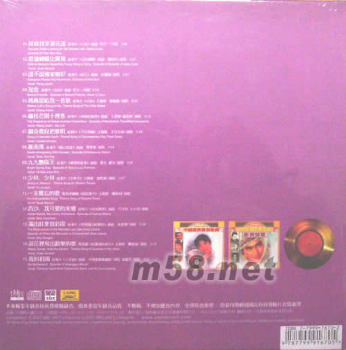 1.妹妹找歌淚花流 故事片(小花)插曲 李谷一/領唱 2.愿做蝴蝶比翼飛 故事片(玉色蝴蝶)插曲 關牧村/演唱 3.誰不說俺家鄉好 故事片(紅日)插曲 彭麗媛/演唱 4.知音 故事片(知音)插曲 李谷一/演唱 5.媽媽留給我一首歌 故事片(小街)主題歌 鄭緒嵐/演唱 6.緬桂花開十里香 故事片 (神秘的旅伴)插曲 王潔實 謝莉斯/演唱 7.翻身農奴把歌唱 紀錄片(今日西藏)主題歌 才旦卓瑪/演唱 8.雁南飛 故事片(歸心似箭)插曲 單秀榮/演唱 9.九九艷陽天 故事片(柳堡的故事)插曲 葉毛 廖莎/演唱 10.少林,少林 故事片(少林寺)主題歌 郁鈞劍/演唱 11.一支難忘的歌 電視連續劇(蹉跎歲月)主題歌 關牧村/演唱 12.西沙,我可愛的家鄉 故事片(南海風云)插曲 呂文科 卞小貞/演唱 13.滿山紅葉似彩云 故事片(等到滿山紅葉時)插曲 朱逢博/演唱 14.浪花里飛出歡樂的歌 電視劇 (哈爾濱的夏天)主題歌 關貴敏/演唱 15.我的祖國 故事片(上甘嶺)插曲 中國歌劇舞劇院/演唱 郭蘭英/領唱