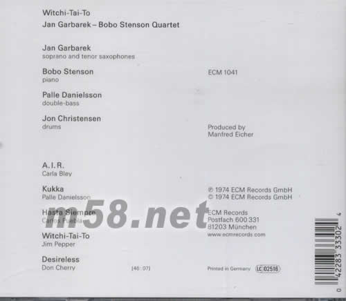 JAN GARBAREK SOPRANO AND TENOR SAXOPHONES BOBO STENSON PIANO PALLE DANIELSSON DOUBIE -BASS JON CHRISTENSEN DRUMS A.L.R. CARLA BLEY KUKKA PALLE DANIELSSON HASTA SIEMPRE CARLOS PUEBLA WITCHI-TAI -TO JIM PEPPER DESIRELESS DON CHERRY