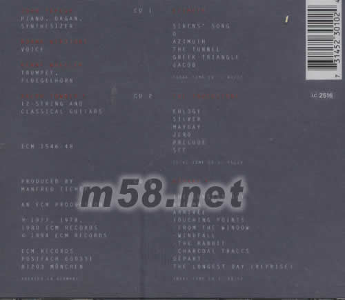 CD1 AZIMUTH SIRENS‘ SONGO AZIMUTH THE TUNNEL GREEK TRIANGLE JACOB CD2 THE TOUCHSTONE EULOGY SILVER MAYDAY JERO PRELUDE SEE CD3 DEPART THE LONGEST DAY AUTUMN ARRIVEE TOUCHING POINTS FROM THE WINDOW WINDFALL GHE RABBIT CHARCOAL TRACES DEPART THE LONGEST DAY (REPRISE)