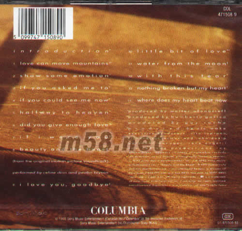 01. love can move mountains 02. show some emotion 03. if you asked me to 04. if you could see me now 05. halfway to heaven 06. did you give enough love 07. if i were you 08. beauty and the beast (from the original motion picture soundtrack) performed by celine dion and peabo bryson 09. i love you,goodbye 10. little bit of love 11. water from the moon 12. with this tear 13. nothing broken but my heart 14. where does my heart beat now