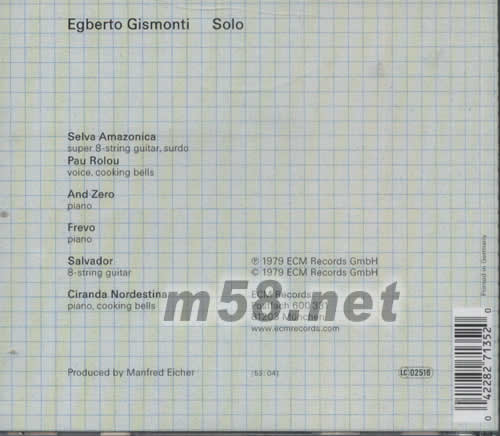 SOLO(m58.net) 巴西多種樂器演奏家Egberto Gismonti是世界知名品牌ECM唱片公司的音樂家之一,他的音樂改變了森巴音樂的歷史。在爵士樂和新音樂領域留下了深刻的烙印。吉斯莫提擅長演奏十弦與八弦吉他,在他的吉他技巧中包括將信用卡夾在弦上,制造出如打擊樂器一般的聲音,綿密跳動的節奏隨著獨特音色充斥在整個聲音空間之中。 作為一個音樂家,他從小接受完整的古典訓練,因而使他有著演繹創作古典音樂的經驗,二十一歲時到巴黎深造,一年半以后,他的老師告訴他:“你現在是個還不錯的歐洲作曲家,卻是個遭透了的巴西音樂人,回去吧!多聽聽森巴,多多研究民謠,知性的學習理論,不如用心傾聽真正發自情感的音樂。”吉斯莫提自此走上融合民樂、古典、爵士、放克的跨界音樂道路,他所承接發揚的巴西民樂傳統,為他的音樂增添了廣闊的深度