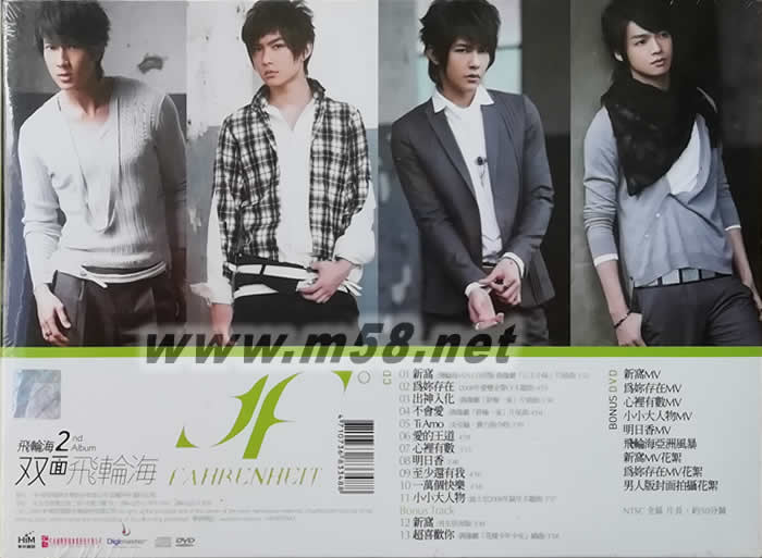 雙面飛輪海(亞洲全勝慶功版)(m58.net) 加送5首MV 及花絮 2008最強男團飛輪海 風暴強襲全亞洲 演歌雙棲最強男團 排行冠軍專輯「雙面飛輪海」 亞洲全勝慶功版 CD+DVD+28頁彩頁寫真詞本 ◎雙面飛輪海亞洲全勝慶功版,超有誠意,全新造型,28頁全彩寫真詞本 ◎DVD豪華收錄新窩、為妳存在、心裡有數(shù)、小小大人物、明日香5首MV及飛輪海亞洲風暴、新窩及為妳存在MV及封面拍攝等花絮,全長近60分鐘,最想珍藏專輯影音內(nèi)容一次擁有!