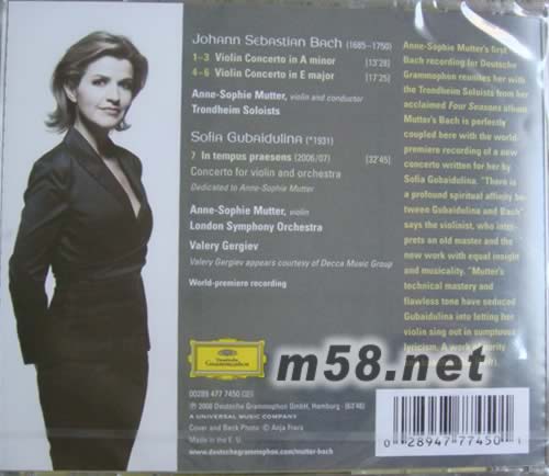 BACH Violin Concerto No.1-2 巴哈 第一 二號小提琴協奏曲(m58.net) 特首次巴哈錄音 慕特,小提琴、指揮特隆赫姆獨奏家樂團/葛濟夫指揮倫敦交響樂團 乍看之下,這張專輯的曲目非常突兀:巴洛克時期的巴哈搭配俄羅斯現代女作曲家古拜都琳娜題獻給慕特的小提琴協奏曲《當下》。事實上,樂曲的搭配相當巧妙:因為巴哈的作品一向是古拜都琳娜的創作靈感。在慕特的詮釋下,愛樂者可以從全新的現代角度來審視巴哈的作品,并且想像假如巴哈身處現代背景,可能會出現什麼樣的創作方向。 古拜都琳娜第二號小提琴協奏曲《當下》創作於2006年至2007年間,由慕特在2007年的瑞士琉森音樂節中首演,2008年初與葛濟夫、倫敦交響樂團錄製。為了突顯出獨奏,古拜都琳娜刪去樂團的小提琴編制,配器相當巧妙,由大鍵琴與打擊樂器搭配華格納低音號,讓音色不至過於單調,抒情的長旋律給了慕特非常大的詮釋空間。而在巴哈的作品裡,慕特再度與當年合作維瓦第《四季》而且廣受好評的年輕團體特隆赫姆獨奏家樂團聯手,打造出別出心裁的現代巴哈。