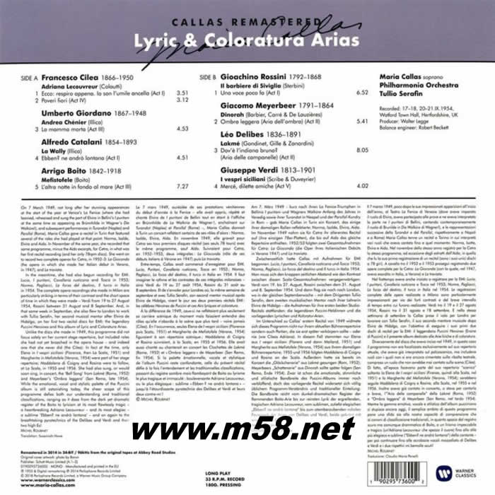 卡拉絲歌劇詠嘆調 LYRIC AND COLORATURA ARIAS 180g 33RPM LP 黑膠專輯背面圖片