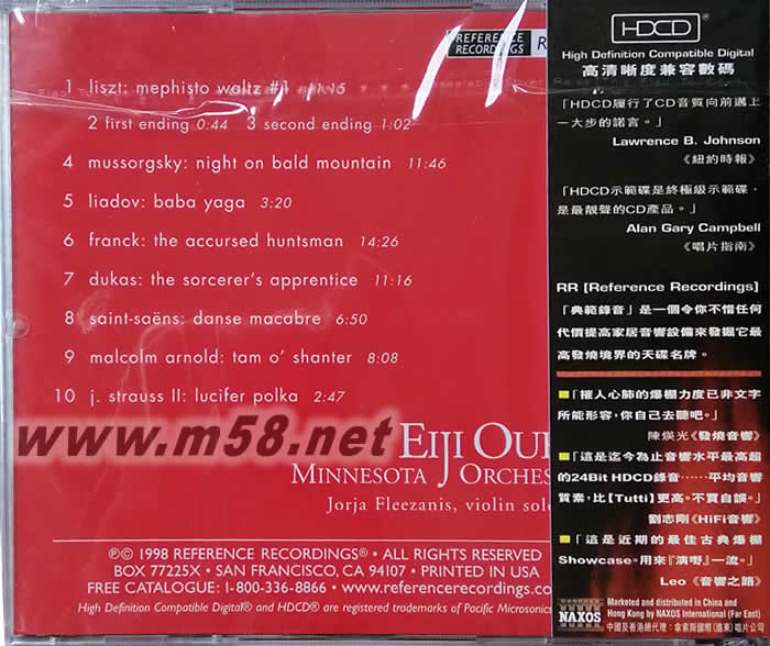 紅魔鬼MEPHISTO 大植英次指揮(m58.net) HDCD履行了CD音質(zhì)向前邁上一大步的諾言。 ——《紐約時報》 HDCD示范碟是終極級示范碟,是最靚聲的CD 產(chǎn)品 ————《唱片指南》 摧人心肺的爆棚力度已非文字所能形容,你自己去聽吧 ————《發(fā)燒音響) 這張《Mephisto & Co.》在國內(nèi)被俗稱為“紅魔鬼”,薈萃了8部由不同作曲家寫作的交響樂名曲。擔(dān)任指揮和演奏的是RR公司的長期合作伙伴——大植英次和明尼蘇達(dá)管弦樂團(tuán)。 明尼蘇達(dá)管弦樂團(tuán)在美國具有悠久的歷史,前身是著名的明尼阿波立斯樂團(tuán),如及依然躋身于全美十大樂團(tuán)之列。著名日籍指揮家小澤征爾的學(xué)生大植英次,在接管樂團(tuán)之后賦予了樂團(tuán)全新的風(fēng)格,與RR公司的錄音合同也讓他與樂團(tuán)逐漸在世界范圍內(nèi)嶄露頭角。當(dāng)然專業(yè)樂評界對大植英次的評價是褒貶不一的,不過在這張《紅魔鬼》唱片中,無論是指揮、樂團(tuán)還是錄音公司,都表現(xiàn)出非常高超的水準(zhǔn),讓這張唱片成為RR最暢銷的HDCD唱片之一。 《紅魔鬼》第一首《李斯特:魔鬼圓舞曲》演繹得驚心動魄,而且在第二、第三首包含了曲目的兩個不同版本的結(jié)尾。第四首則是唱片中的精彩段落,即俄羅斯著名的五人強(qiáng)力集團(tuán)成員之一的穆索爾斯基所寫的傳世之作“荒山之夜”。RR的這個版本無疑是最具特色的演繹之一,尤其是曲目緊張激烈的前半部分,在強(qiáng)力的銅管和打擊樂支持下,在優(yōu)秀的錄音技術(shù)和HDCD輔助下,給人石破天驚的超凡感覺。其余的作品也具有一定的可聽性。