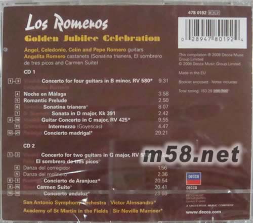 羅梅洛吉他四重奏50週年紀(jì)念專輯(m58.net) 由羅梅洛吉他家族所組成的羅梅洛吉他四重奏團(tuán),被譽(yù)為“吉他界的貴族世家”。 該團(tuán)由父親契蘭多尼歐羅梅洛在1960年創(chuàng)團(tuán),由他和三個(gè)兒子安杰、席林和佩佩共同組成,這三個(gè)兒子在他的栽培下,皆於七歲之年就舉行吉他獨(dú)奏會(huì)。 后來羅梅洛一家從西班牙遷到美國定居,中間這個(gè)四重奏因?yàn)榘步茉?990年尋求個(gè)人獨(dú)奏生涯,而由席林的兒子席林諾替代他在團(tuán)中的位置,老父親契蘭多尼歐在1996年過世,又由安杰的兒子利托取代爺爺?shù)奈恢谩F跆m多尼歐羅梅洛出身於馬德里音樂院,西班牙作曲家屠黎納是他的老師,后來因?yàn)榉ɡ矢鐚④娨l(fā)的西班牙內(nèi)戰(zhàn)和獨(dú)裁統(tǒng)治,他選擇離開西班牙在美國定居,之后他除了教導(dǎo)三個(gè)孩子成為吉他家,自己也寫作吉他音樂,創(chuàng)作了十多首吉他協(xié)奏曲。作為羅梅洛王朝的創(chuàng)建人,美國葛萊美獎(jiǎng)還特別在去年頒獎(jiǎng)給他和三個(gè)兒子所組成的羅梅洛四重奏。 這兩張所選錄的曲目,是過去三十年間羅梅洛家族最暢銷的錄音,其中他們改編韋瓦第為四把小提琴、雙小提琴所寫的協(xié)奏曲、以及為曼陀林和雙曼陀林所寫的協(xié)奏曲為吉他演奏,多年來一直受到愛樂者喜愛,且沒有其他吉他團(tuán)體能偷走他們的光環(huán)和銷售成績(jī)。另外由佩佩羅梅洛改編自比才卡門整套組曲供吉他四重奏團(tuán)演奏,也是和改編韋瓦第作品同樣讓人大出意料的創(chuàng)舉。片中另外收錄了三首羅德瑞格的吉他協(xié)奏曲,除了著名的阿蘭輝茲外,還有為雙吉他寫的牧歌協(xié)奏曲和為四吉他所寫的安達(dá)魯西亞協(xié)奏曲。其中后者正是由契蘭多尼歐親自向羅德瑞格委託,以羅梅洛吉他四重奏為對(duì)象量身打造的作品,由他們這個(gè)首演團(tuán)體來詮釋這首作品,不但相得益彰,更為后世留下代表性的經(jīng)典。