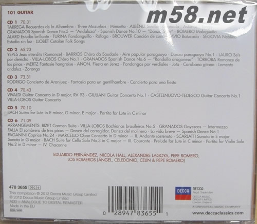 101 GUITAR 101 吉它殿堂大師精選套裝101古典系列6CD套裝 德版(m58.net) 2012全新101最愛系列 古典名廠牌DECCA超值6CD必備曲目,殿堂大師演繹 DECCA唱片官方試聽網址(片段): http://www.deccaclassics.com/cat/single?sort=newest_rec&PRODUCT_NR=4783655&SearchString=028947836551&UNBUYABLE=1&per_page=50&flow_per_page=50&presentation=flow