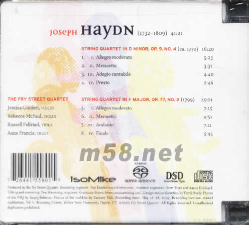 HAYDN STRING QUARTETS OP 9 NO 4 AND OP 77 NO 2 SACD(m58.net) JESSICA GUIDERRI /小提琴 REBECCA MCFAUL/小提琴 RESSELL FALLSTAD/中提琴 ANNE FRANCIS/大提琴 制作于:美國UT洲