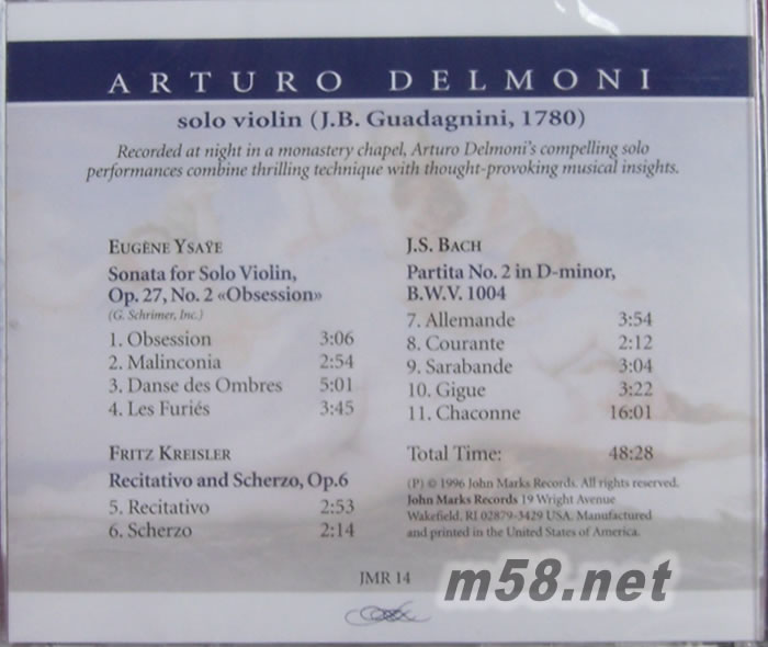 ARTURO DELMONI solo violin (J.B.Guadagnini,1780) Recorded at night in a monastery chapel,Arturo Delmoni's compelling solo Performances combine thrilling technique with thought-Provoking musical insights. EUGENE YSAYE Sonata for Solo Violin,Op.27,No.2[Obsession](G.Schrimer'Inc.) 01. Obsession 02. Malinconia 03. Danse des Ombres 04. Les Furies FRITZ KREISLER Recitativo and Scherzo,Op.6 05. Recitativo 06. Scherzo J.S.BACH Partita No.2 in D-minor,B.W.V.1004 07. Allemande 08. Courante 09. Sarabande 10. Gigue 11. Chaconne
