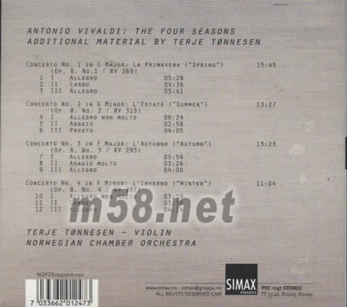 四季鮮明VIVALDI 4 SEASONS 劉漢盛推介(m58.net) 四季鮮明 著名小提家 Terje Tonnesen與 norwergian chamber orchestra重新編曲及演繹韋華弟的四季,配合四季的不同景致加插了特別的效果,與季麗的弦樂交織出這首家喻戶曉的名曲,四季鮮明全新感受.