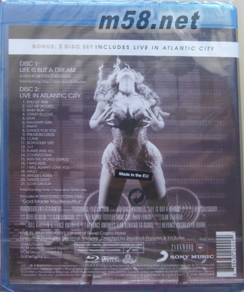 DISK 1 藍(lán)光BD 編號 曲名 試聽 1. Life Is But A Dream DISK 2 藍(lán)光BD 編號 曲名 試聽 1. Live In Atlantic City End Of Time 時(shí)間盡頭 2. Get Me Bodied 貼身共舞 3. Baby Boy 親愛男孩 4. Crazy In Love 瘋狂愛戀 5. Diva 玩美女神 6. Naughty Girl 淘氣女孩 7. Party 私人派對 8. Dance For You 為你起舞 9. Freakum Dress 魔力裙 10. I Care 只有我在乎 11. Schoolin` Life 學(xué)校生活 12. 1+1 1加1 13. Flaws And All 殘缺與全部 14. Countdown 倒數(shù) 15. Run The World (Girls) 女人我最大 16. I Was Here 存在過 17. I Will Always Love You 永遠(yuǎn)愛你 18. Halo 光環(huán) 19. Single Ladies 單身女郎 20. Green Light 綠燈 21. Love On Top 放在第一位的愛