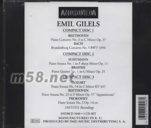 COMPACT DISC 1: BEETHOVEN 1.PIANO CONCERTO NO.3 IN C MINOR OP.37 BACH 2.BRANDENBURG CONCETTO NO.5 BWV 1050 COMPACT DISC 2: SCHUMANN 1.PIANO SONATA NO.1 IN F SHARP MINOR OP.11 BRAHMS 2.PIANO QUARTET NO.1 IN G MINOR OP.25 COMPACT DISC 3: MOZART 1.PIANO SONATA NO.14 IN C MINOR KV 457 BEETHOVEN 2.PIANO SONATA NO.23 IN F MINOR OP.57 "APPASSIONATA" PROKOFIEV 3.PIANO SONATA NO.2 OP.14 ETC 1947/1951 RECORDINGS ANDRCD 5046·3CD SET MANUFACTURED IN E 。U PRODUCED BY IMD MUSIC DISTRIBUTING S.A