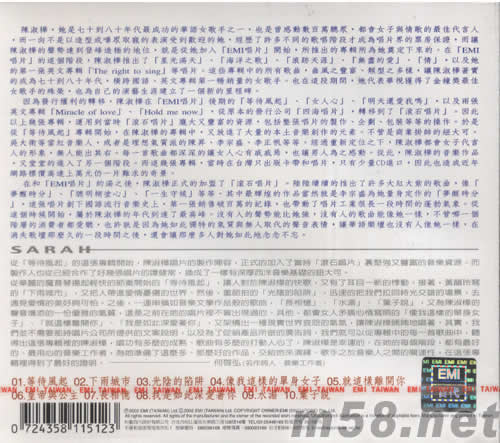 等待風起(m58.net) 華語樂壇首席都會情歌代言人 開創新都會情歌首部曲 陳淑樺,她是七十到八十年代最成功的華語女歌手之一,也是曾感動數百萬聽眾,都會女子與情歌的最佳代言人,而一向不是以造型或嘩眾取寵的表演受到歡迎的她,經歷了許多不同的歌唱階段才成為唱片界的票房保證,而讓陳淑樺的聲勢達到登峰造極的地位,就是從她加入[EMI唱片]開始,所推出的專輯所為她奠定下來的。在[EMI唱片]的這個階段,陳淑樺推出了[星光滿天]、[海洋之歌]、[浪跡天涯]、[無盡的愛]、[情],以及她的第一張英文專輯[The right to sing]等唱片。這些專輯中的所有歌曲,曲風之豐富 、類型之多樣,讓陳淑樺著實的成為七十到八十年代,橫跨國語、英文專輯第一暢銷量的女歌手。也在這段期間,她代表華視獲得了金鐘獎最佳女歌手的殊榮,也為自己的演藝生涯建立了一個新的里程碑。 因為發行權利的轉移,陳淑樺在[EMI唱片]后期的[等待風起]、[女人心]、[明天還愛我嗎],以及兩張英文專輯[Miracle of love]、[Hold me now],從原本的發行公司[四海唱片],轉移到了[滾石唱片]。因此以上幾張專輯,運用到當時[滾石唱片]龐大又豐富的資源,包括整張唱片的制作、企劃、包裝等等的操作。于是從[等待風起]專輯開始,在陳淑樺的專輯中,又放進了大量的本土音樂創作的元素。不管是商業掛帥的鈕大可、吳大衛等當紅音樂人,或者是理想氣質派的陳升、李宗盛、李正帆等等。經過重新定位之下,陳淑樺都會女子代言人的形象,無人能出其右。每一首歌曲都深深地讓女人心有戚戚焉,也讓男人為之感動。從此,陳淑樺的音樂作品,又堂堂的進入了另一個階段。而這幾張專輯,當時在臺灣只出版卡帶和唱片,只有少量CD進口,因此也造成近年網路標價高達上萬元仍一片難求的奇景。 在和[EMI唱片]約滿之后,陳淑樺正式的加盟了[滾石唱片]。陸陸續續的推出了許多大紅大紫的歌曲,像[夢醒時分]、[聰明糊涂心]、[一生守候]等等。其中最輝煌的作品當然就是李宗盛為她量身定作的[夢醒時分],這張唱片創下國語流行音樂史上,第一張銷售破百萬的記錄,也帶動了唱片工業很長一段時間的蓬勃氣象。從這個時候開始,屬于陳淑樺的年代到達了最高峰。沒有人的聲勢能比她強,沒有人的歌曲能像她一樣,不管哪一個階層的消費者都愛聽,也許就是因為她如此獨特的氣質與無人取代的聲音表情,讓華語樂壇也沒有人像她一樣,在消失歌壇那么久的一段時間之后,還會讓那么多人對她如此地念念不忘。
