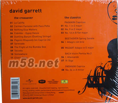 FREE(超人氣小提琴彗星3CD豪華版)(m58.net) 這款《自由》由Decca唱片公司發行于2007年,內收錄大衛•格瑞特演奏的多首精彩小提琴樂曲。 當大衛•格瑞特還是個小男孩,很多古典樂迷就已經聽聞其小提琴造詣。大衛•格瑞特的傳奇故事,他的音樂天才及傲人功力,隨著每一次弓弦恣意揮灑,流瀉出令人神魂顛倒的詩篇。大衛•格瑞特擁有其它音樂人夢寐以求的豐富巡演經驗,與世界一級樂團同臺,在教宗、各國皇室成員、多國總統等人面前獻藝,都是家常便飯。11歲為德國總統表演,因他的精彩演出而印象深刻,進而為他安排了一部無價的1718年史特拉底瓦里小提琴,讓他作為日后演出使用。1990年赴羅馬參加教宗若望保祿二世擔任教宗50周年慶祝活動,當時,他也才16歲。這個天才神童的盛名,讓他在年輕的成長過程中,便已嘗到了人生的苦澀與甜美。 大衛•格瑞特除了自小鉆研古典音樂,師承曼紐因及帕爾曼等巨擘之外,其實也喜歡聆賞各種流行音樂。乍聽之下可能會引發沖突的兩種極端,卻在他自己主導的新專輯《自由》中,達到了一種美麗又神秘的平衡。他更嘗試將更多音樂元素,包括流行、搖滾、節奏藍調等風格,融合進他的古典提琴音樂世界里。充滿異國情調的《卡門幻想曲》,不慍不火地歌頌出令人玩味的世界名曲;蒙蒂的名曲《查爾達斯舞曲》,大衛•格瑞特巧妙的琴音貫穿全曲,熱鬧奔放中賦予19世紀經典一個充滿熱力的新生命。 專輯一開場,大衛•格瑞特便對顏尼歐•莫利克奈致意,用全球配樂大師的催淚經典《卡理法女士》釋放溫柔的關懷。音樂劇《西城故事》的不朽金曲《某處》,表示對他心中的偉大偶像伯恩斯坦的尊敬。而電影《激流四勇士》中的《五弦琴決斗》,大衛•格瑞特改用提琴跟吉他來競逐,更是一絕。他改編其偶像搖滾名團金屬樂隊金曲《無所謂了》,以德彪西式的敘事語法,代替了原始歌詞,更超越了原曲挑動聽者內心深處的無盡哀愁感。而身為小提琴之神帕爾曼的第一位入室弟子,他也展現在茱莉亞音樂院雙修的功力,貢獻出個人三首精彩創作,特別是以搖滾概念挑戰古典樂極限的《觸技曲》,以扎實的基本功,反復撞擊剽悍的電吉他,緊張對峙、高潮不斷!