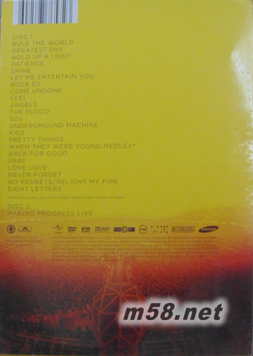 DISK 1 DVD 1. Rule The World 2. Greatest Day 3. Hold Up A Light 4. Patience 5. Shine 6. Let Me Entertain You 7. Rock DJ 8. Come Undone 9. Feel 10. Angels 11. The Flood 12. SOS 13. Underground Machine 14. Kidz 15. Pretty Things 16. When They Were Young Medley 17. Back For Good 18. Pray 19. Love Love 20. Never Forget 21. No Regrets/Relight My Fire 22. Eight Letters 23. includes A Million Love Songs, Babe, Everything Changes DISK 2 DVD 1. Making Progress Live