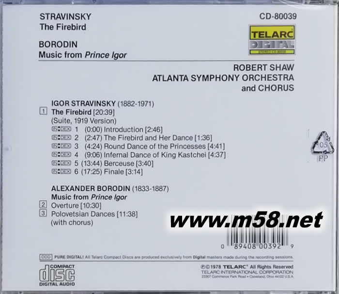 THE FIREBIRD 斯特拉文斯基 火鳥組曲(m58.net) 指揮:ROBERT SHAW ATLANTA SYMPHONY ORCHESTRA亞特蘭大交響樂團 及合唱團 一張令愛樂者暈眩,也一向是音樂發燒友最狂熱的曲目:羅伯特·肖 - 斯特拉文斯基:火鳥 / Robert Shaw - Stravinsky: Firebird Suite CD (CD80039 ) 羅伯特?肖(Robert Shaw)的《斯特拉文斯基:火鳥》(Stravinsky: Firebird Suite)在2009年的《企鵝古典唱片指南》中推薦為三星。斯特拉文斯基創造了20世紀音樂的諸多奇跡,以至于在今天,無論是多么嚴肅的愛樂者,還是多么獵奇的音樂發燒友,都能從他的音樂中得到樂趣。《火鳥》的音樂神秘而美麗,而某些場景的音響又極其火暴。這既令愛樂者暈眩,也一向是音樂發燒友最狂熱的曲目。 羅伯特?肖指揮亞特蘭大交響樂團演奏斯特拉文斯基《火鳥》,是這個曲目的著名發燒版本 《火鳥》由三部組曲組成,敘述的是俄羅斯神話,沙皇的兒子伊凡王子在森林中打獵時,遇到一雙長有火樣羽毛的神奇鳥,正在銀樹上摘食金色水果;火鳥以一根神奇羽毛與王子交換自己的自由。被魔法詛咒的城堡中,王子見到了13位公主載歌載舞、玩耍著金蘋果;盡管王子被警告邪惡的魔法師會將每位路過行人都變成石頭,王子仍然不顧一切進入古堡。正當魔法師欲加害王子時,神奇的火羽救了他,火鳥適時出現,讓魔法師與他的食人巨妖不停地狂舞直至虛脫而止;受害者恢復人形,公主重獲自由,而王子也贏得其中一位公主的芳心。本劇于1910年首演,因為該芭蕾舞劇的風格與當時古典流派風格大相徑庭,頗有爭議。但隨著時代的推移,史特拉汶斯基的音樂最終贏得國際間熱烈的贊譽。 羅勃·蕭基本上統治了美國發燒公司TELARC(泰勒克)的整個錄音時代,留下了不少傳奇的發燒錄音,以超猛巨大的動態和無可比擬的爆發感著稱,而《火鳥》則是其中著名的一部作品。更兼另一曲目蕭邦的波蘭舞曲,又是這位鋼琴天才最發燒作品的發燒錄音。 整張唱片,除了“美”二字,實在不知再怎么形容。因此,同時被TAS榜和企鵝唱片榜評為上榜唱片實至名歸,沒半分花假。