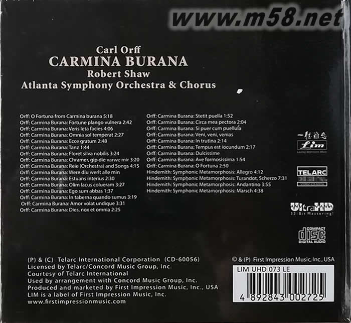 01.卡爾奧夫:布蘭詩歌-O Fortuna 5:18 02.卡爾奧夫:布蘭詩歌-Fortune plango vulnera 2:42 03.卡爾奧夫:布蘭詩歌-Veris leta facies 4:06 04.卡爾奧夫:布蘭詩歌-Omnia sol temperat 2:27 05.卡爾奧夫:布蘭詩歌-Ecce gratum 2:48 06.卡爾奧夫:布蘭詩歌-Tanz 1:44 07.卡爾奧夫:布蘭詩歌-Floret silva nobilis 3:24 08.卡爾奧夫:布蘭詩歌-Chramer, gip die varwe mir 3:20 09.卡爾奧夫:布蘭詩歌-Reie (Orchestra) and Songs 4:15 10.卡爾奧夫:布蘭詩歌-Were diu werlt alle min 11.卡爾奧夫:布蘭詩歌-Estuans interius 2:30 12.卡爾奧夫:布蘭詩歌-Olim lacus colueram 3:27 13.卡爾奧夫:布蘭詩歌-Ego sum abbas 1:37 14.卡爾奧夫:布蘭詩歌-In taberna quando sumus 3:19 15.卡爾奧夫:布蘭詩歌-Amor volat undique 3:31 16.卡爾奧夫:布蘭詩歌-Dies, nox et omnia 2:25 17.卡爾奧夫:布蘭詩歌-Stetit puella 1:52 18.卡爾奧夫:布蘭詩歌-Circa mea pectora 2:04 19.卡爾奧夫:布蘭詩歌-Si puer cum puellula 20.卡爾奧夫:布蘭詩歌-Veni, veni, venias 21.卡爾奧夫:布蘭詩歌-In trutina 2:14 22.卡爾奧夫:布蘭詩歌-Tempus est iocundum 2:17 23.卡爾奧夫:布蘭詩歌-Dulcissime 24.卡爾奧夫:布蘭詩歌-Ave formosissima 1:54 25.卡爾奧夫:布蘭詩歌-O Fortuna 2:50 26.亨德米特:交響變奏曲-Allegro 4:12 27.亨德米特:交響變奏曲-Turandot, Scherzo 7:31 28.亨德米特:交響變奏曲-Andantino 3:55 29.亨德米特:交響變奏曲-Marsch 4:38