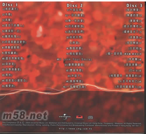DISC 1 1、叛逆漢子 2、冬戀 3、再會 4、星空下的戀人 5、最深刻一次 6、難得有情人 7、仍是那么深愛你 8、患難建真情 9、愛恨纏綿 10、當世界無玫瑰 11、夜迷宮 12、失戀演奏家 13、黑豹 14、這是我心里對白 15、親愛的 DISC 2 1、午夜狂奔 2、一切也愿意 3、戀一世的愛 4、仍流著眼淚 5、為何是我們 6、地老天荒 7、梵音 8、制造迷棼 9、現在愛我 10、I LOVE YOUR SMILE 11、離開請關燈 12、雙星情歌 13、休說不 14、真假情話 15、一首獨唱的歌 DISC 3 1、假的戀愛 2、無盡的愛 3、夢劇場 4、逝去的傳奇 5、繼續星光下 6、夜靠誰 7、告別戀曲 8、忘記他 9、唱一首好歌/譚詠麟 關淑怡 10、李香蘭 11、深夜港灣 12、DELA 13、他需要你,她需要你 14、人生可有知已 15、天涯哥處覓真心