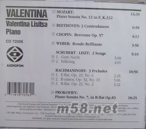 1.MOZART: PIANO SONATA NO.12 IN F,K.332 2.BEETHOVEN:3 CONTRADANCES 3.CHOPIN:BERCEUSE OP.57 4.WEBER:RONDO BRILLIANTE SCHUBERT-LISZT:2 SONGS 5.GUTE NACHT 6.ERLKONIG RACHMANINOFF:3 PRELUDES 7.E-FLAT,OP.23, NO.6 8.B MINOR,OP.32,NO.10 9.B-FLAT,OP.23,NO.2 10.PROKOFIEV: PIANO SONATA NO.7,IN B-FLAT OP.83