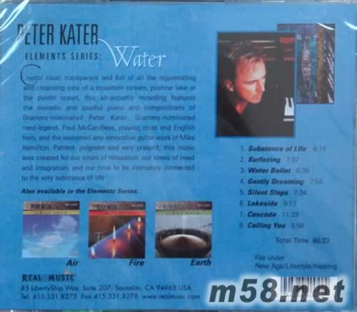 水之樂章 WATER 新世紀純音樂(m58.net) 鋼琴大師PETER KATER,以水為主題創作出八首鋼琴作品,將水的萬千形態以音樂方式表現出來,靜止的水的靜態的旋律,流動的水亦有活潑多變的旋律,加上雙簧管及結他相互配合,令完美的旋律更錦上添花。 彼得?卡特爾是為廣播電視、影片和劇院的輕爵士樂和新世紀音樂方面眾所周知的鋼琴演奏家、作曲家。彼得?卡特爾從慕尼黑移居新澤西后,學了三年鋼琴課程,還學習了古典音樂和搖滾。他18歲就在哥倫比亞巨石城演奏即興創作的音樂,并且在移居弗吉尼亞鄉村之前就建立了“Earth Sea”工作室。 彼得?卡特爾2005年開始發行“宇宙要素理療系列”的四元素專輯《Elements Series: Earth》、《Elements Series: Water》、《Elements Series: Air》和《Elements Series: Fire》,為此他得到一個格萊美的“最佳新世紀音樂”提名。 這張《Elements Series: Water》專輯,就像山泉、潔凈的湖水、湛藍的海洋,是如此的清澈、透明,聽起來特別悅耳。這張專輯中的演奏家有獲得格萊美提名的彼得?卡特爾,音樂的旋律優美,聽者能明顯感覺到那種深情;也有獲得格萊美提名的簧管樂器傳奇人物Paul Mccandless演奏雙簧管和英國管;還有Mike Hamilton那老練而富有新意的吉他演奏,絕對值得收藏。 專輯曲目