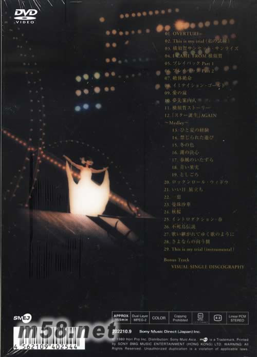 山口百惠告別藝壇演唱會DVD(m58.net) ~經典之最終回~ 山口百惠.告別樂壇演唱會 <金裝豪華版> 155分鐘感動舞臺全記錄 真情演繹27首家喻戶曉代表作,包括: This is my trail~ 我的考驗,再見的另一方,曼珠沙華,秋櫻,橫須賀的故事,少女心事,絕體絕命,冬之色 在晴朗的一天出發,Rock n'roll widow...