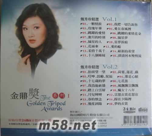 甄秀珍精選Vol.1 01. 一顆情淚 02. 我把一切告訴你 03. 玫瑰年華 04. 愛在春風里 05. 跳躍的愛情 06. 跳躍的愛情花朵 07. 蜜月的時刻 08. 摘星夢 09. 摘星的人 10. 星夢淚痕 11. 花雨傘 12. 愛的船 13. 柔情千萬千 14. 嶄新的希望 15. 十八個姊妹 16. 清清河水慢慢流 甄秀珍精選Vol.2 01. 抬頭望一望 02. 荷葉.蓮花.藕 03. 叮嚀.鼓勵.祝福 04. 那是心愿 05. 十七歲的夢 06. 七孔笛 07. 我為他祈禱 08. 風飄飄云飄飄 09. 踏上白云層 10. 瘋女十八年 11. 月兒彎彎 12. 云想衣裳花想容 13. 春的懷念 14. 踩在夕陽里 15. 幾度斜陽 16. 夢的衣裳