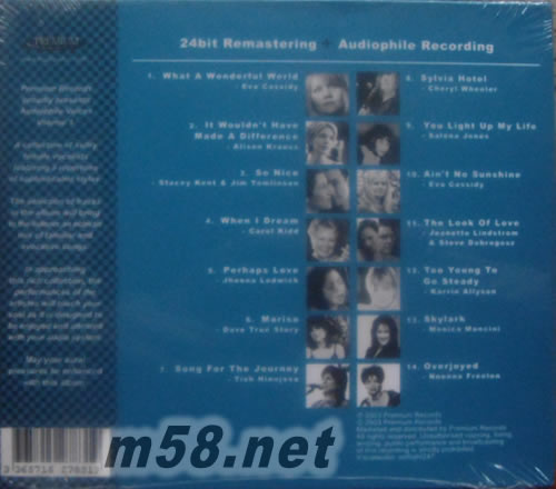 爵士紅伶BEST AUDIOPHILE VOICES第一輯(m58.net) 爵士紅伶,二十世界最佳發燒女聲覽聽版。一張匯聚了世界各地一流天后女星如:CAROL KIDD、 EVA CASSIDY、STACEY KENT 、JHENNA LODWICK、ALISON KRAUSS、JANE MONHEIT等等于一碟。打做了發燒界最佳女聲覽聽版專輯。每位巨星都施展了畢生“嗓藝”,演繹了十五首各國樂迷一致贊賞經典金曲。人聲靚絕、質感強烈、層次分明、定位準確、通透無比音色,加上粒粒巨星名曲,頂級發燒錄制,這份誠意[爵士名伶]大碟,足以令每位發燒樂迷怦然心動。