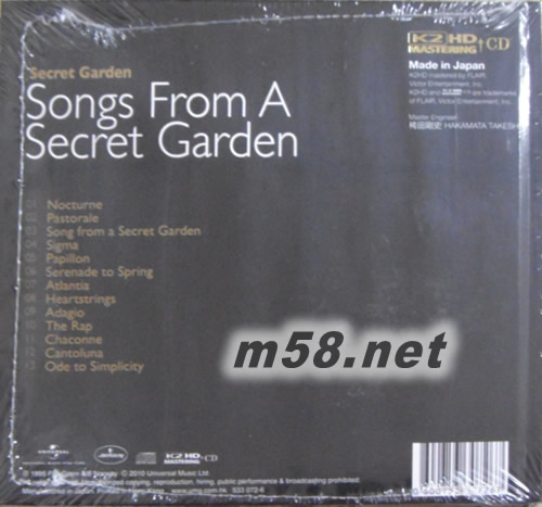 SONGS FROM A SCERET GARDEN (環球K2HD系列)(m58.net) 劃時代頂級發燒母版處理 K2HD Mastering 將100KHz寬頻帶/24bit音頻信息載入 音色更接近模擬(Analogue)聲效 心靈音樂始祖 零汚染之金曲 潔凈如水