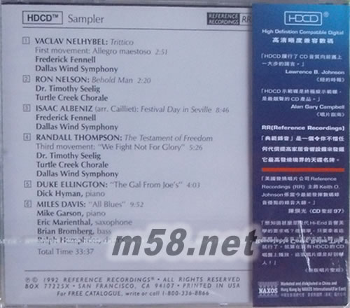 HDCD SAMPLER 示范天碟第一輯 HIGH DEFINTION COMPATIBLE DIGITAL(m58.net) 《RR HDCD示范天碟第一輯》是美國著名發燒錄音品牌RR在1992年發行的第一張HDCD效果示范碟,收入了以該技術制作的6段爆棚錄音。RR這家成立于1976年的唱片公司從誕生之日起就以高保真的聲音還原效果為訴求,并在CD唱片音質改良方面做出了很大的努力。 1992年他們推出的“HDCD數碼錄音技術”無疑是RR最杰出的成就之一。HDCD的全稱“High Definition Compatible Digital”直譯為“高清晰度CD”,它以傳統CD唱片為載體,提高了錄音回放的清晰度、層次感、空間感以及動態、定位等諸多方面,迅速被業界所認可。而在擁有HDCD解碼芯片的唱機上,這些提升則更為明顯!如今HDCD已經通過技術授權而被業界諸多唱片公司所廣泛采用。