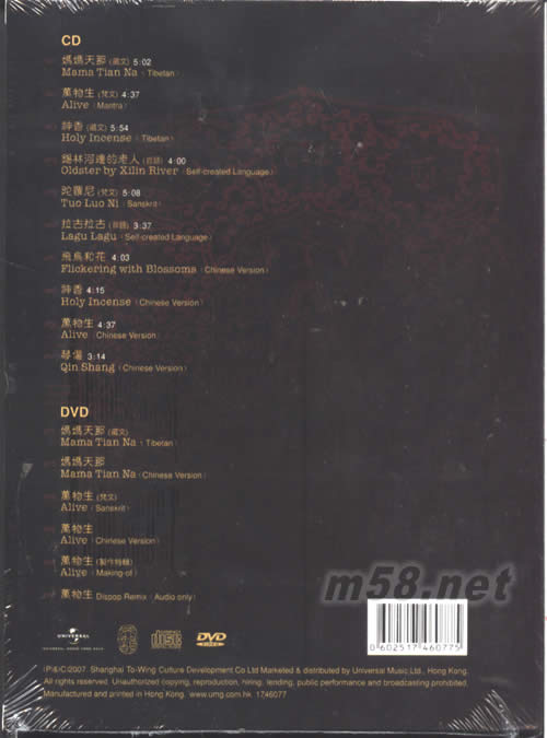 CD 01. 媽媽天那(藏文) 02. 萬物生(梵文) 03. 神香(藏文) 04. 錫林河邊的老人(自語) 05. 陀羅尼(梵文) 06. 拉古拉古(自語) 07. 飛鳥和花 08. 神香 09. 萬物生 10. 琴傷 DVD 01. 媽媽天那(藏文) 02. 媽媽天那 03. 萬物生(梵文) 04. 萬物生 05. 萬物生(制作特輯) 06. 萬物生 Dispop Remix(Audio only)