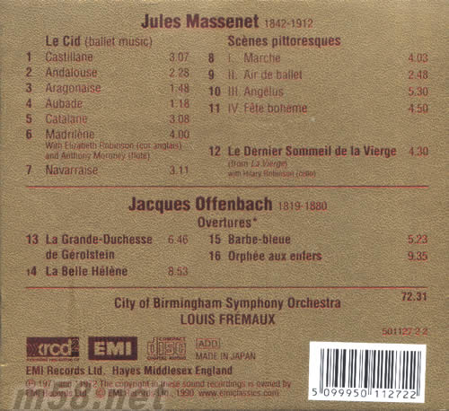 馬斯奈:熙德(領(lǐng)袖),奧芬巴赫:序曲集XRCD(ABS錄音室XRCD系列)(m58.net) 馬斯奈:熙德(領(lǐng)袖),奧芬巴赫:序曲集,包括:美麗的海倫,地獄中的奧菲斯等,伯明翰交響樂(lè)團(tuán),弗雷莫指揮。企鵝三星名盤