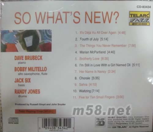 有什么新鮮事兒?Brubeck:So What’s New(m58.net) 爵士大師戴夫‧布魯貝克的全新作品 一九二0年出生的戴夫.布魯貝克。十三歲時即在家鄉參加樂團的演出。選位杰出的鋼琴家及樂團領導者在五、六0年代不但是酷派爵士的先驅,更受到當時知識份子的熱烈歡迎,在魯貝克的成功也扭轉了里人在爵士樂壇獨佔一方的態勢。年輕時當投身法國作曲家未完整(Darius Milnaud )門下的布魯貝克,濃烈的古典音樂氣質持續地影響著他的作曲和演奏風格。甫過七十七歲生日的布魯貝克,在長年縱橫樂壇的生涯中,不斷地出令人激賞的篇章,此張全新的作品,更新的重奏組合,不但揭示了他對爵士樂的熱戀,不因年齡而消減,更帶領爵士樂進入即將到來的下個世紀!