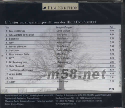 測試 9 LIFE STORIES VOLUME 9(m58.net) 德國高級音響協會High-End Society專門搜集Chesky、Opus3、Glitterhouse、Triloke Records、lrak等歐洲發燒品牌的著名錄音,編輯成測試CD作為每年在法蘭克福舉行的展覽會之用,這些錄音內容豐富,音效上乘。喜見第9輯收錄的曲目全屬可圈可點的示范級作品:14首極品電平統一,調節音量,驚人的數碼3D感在音場中即將營造出龐大飽滿的量感和質感,充滿整個空間畫出立體舞臺,我坐在皇帝位上驚嘆兩只喇叭在渾響中自然消失,立體透視出歌者的位置、咀形、喉音振動聲和齒音水聲,男聲質感從容厚度各類功架,女聲深情專注韻味獨領風騷,各種獨奏樂器美感與質感共存,音效之佳令人神魂顛倒,錄音不但主題突出,同時注重整體平衡,主唱與伴奏在即與中交融,構成細膩鮮明的層次感和提供逼真樂器聲的分隔比例,妙不可言。