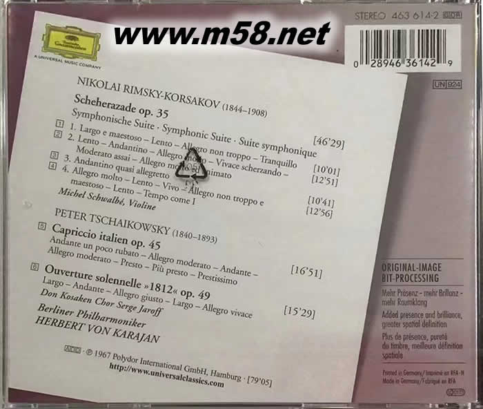 卡拉揚 - 里姆斯基-柯薩科夫:天方夜譚組曲 & 柴科夫斯基:1812序曲Rimsky-Korsakov: Scheherazade & Tchaikovsky: 1812 Overture 大禾花版(m58.net) DG公司這款《里姆斯基-柯薩科夫:天方夜譚組曲 & 柴科夫斯基:1812序曲》CD,于2000年出版發行,由指揮大師赫伯特?馮?卡拉揚指揮柏林愛樂樂團演出灌錄。 柴科夫斯基的《1812序曲》完成于1880年10月,是尼古拉?魯賓斯坦委托柴科夫斯基為莫斯科藝術工業博覽會創作的作品,也是柴科夫斯基最受人們歡迎的作品之一。作品于1882年8月8日首次演出時,就受到了聽眾極其熱烈的歡迎。音樂中所表現出來的愛國主義思想,加上樂隊宏大的氣勢以及樂曲末段的鐘、鼓和排炮齊鳴的熱烈氣氛,使當時的聽眾非常興奮,演出獲得了極大的成功。演出中動用了超大規模的樂隊,并在結尾處加了一個軍樂隊,還動用了大炮。這部序曲能為柴可夫斯基贏得聲謄并被推為他的代表作品,是作者沒有預料到的。 里姆斯基-柯薩科夫的《天方夜譚組曲》作于1888年,同年在彼得堡首演。《天方夜譚組曲》取材于著名的阿拉伯民間故事集《一千零一夜》。里姆斯基-柯薩科夫在初版總譜上介紹了原作的梗概:古代阿拉伯的蘇丹王沙赫里亞爾專橫而殘酷,他認為女人皆居心叵測而不貞,于是他每天娶一位新娘,次日便處死。機智的少女山魯佐德嫁給這位蘇丹王之后,在當夜給蘇丹王講了一個離奇生動的故事。第二天,這個故事正講到關鍵之處,被山魯佐德的故事所深深吸引的蘇丹王,為了繼續聽下去,破例沒有處死山魯佐德這位新娘。之后,山魯佐德又以同樣的方式給蘇丹王講了一連串的動聽故事,一直講了一千零一個夜晚。最后,蘇丹王被山魯佐德的故事所感化,終于徹底放棄了殘酷的念頭,決心與山魯佐德白頭偕老。 《天方夜譚組曲》全曲共分為四個樂章,在最早出版的總譜中,每個樂章均附有標題,標題內容取自《一千零一夜》里的故事:第一樂章“海洋與辛巴達的船”;第二樂章“卡倫德王子的故事”;第三樂章“王子與公主”;第四樂章“巴格達的節日,大海,船在聳立著青銅騎士的巖石旁遇難,終曲”。但在重版時,作者將各樂章的小標題全部刪去了。看來作者后來并不希望本曲具有過于明確的標題內容。在這首富于造型性、色彩性的組曲中,里姆斯基-柯薩科夫充分發揮了他的造型能力與幻想力。在這里起著重要作用的不是情緒的緊張度和戲劇性,而是色彩和裝飾的對照性配置,是優美的節奏和出色的表現力。在這部大規模展開的東方風格的交響組曲中,有著用音響來表現的風光景物、風俗性場面、傳奇性故事以及抒情性的插曲。 赫伯特?馮?卡拉揚的指揮動作灑脫、大方、氣勢磅礴,并以準確和客觀著稱。在指揮臺上卡拉揚經常閉目深思,使得樂隊各聲部之間達到了演奏室內樂般的默契。在他的領導下,柏林愛樂樂團展現出了一種有如金屬般的亮色,被譽為卡拉揚“音響”。卡拉揚指揮時不僅自己全身心投入音樂之中,而且還善于啟發樂隊隊員,使他們懂得如何演奏,用魔法般的動作牢牢吸引住樂隊。他所追求的目標就是,“把托斯卡尼尼的精確與富爾特文格勒的幻想結合在一起”。正是赫伯特?馮?卡拉揚的音樂天賦,加上對樂曲的正確理解和對樂隊的嚴格要求,他的演出總能達到超常出眾的藝術水平。